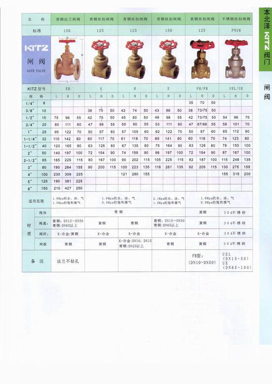 日本北澤KITZ銅閘閥:是指關(guān)閉件(閘板)沿通道軸線的垂直方向移動的閥門,在管路上主要作為切斷介質(zhì)用,即全開或全關(guān)使用。內(nèi)螺紋連接的閘閥與管端相連接,需控制管端外螺紋長度尺寸。以免管端過量旋入以致頂壓閘閥管螺紋內(nèi)端面,造成閥座變形而影響密封性。法蘭連接閥門的法蘭與管端的法蘭不僅與規(guī)格尺寸一致,而且需公稱壓力一致。