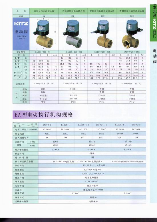 日本北澤KITZ電動球閥是部分旋轉類球閥,旋轉90°即可全關全開,與相同規格的閘閥和截止閥比較,球閥體積小、重量輕、功能強大、可靠性高、便于管道安裝等。密封性能優良,流通能力大,流阻系數小,結構簡單、維修方便、使用壽命長。閥體通道和連接管徑相等并成一直徑,介質幾乎可以毫無損失的流過。產品通常用于密封要求嚴格的場合,除控制氣體、液體、蒸汽介質外,還適宜控制污水和含有纖維性雜質的介質。
